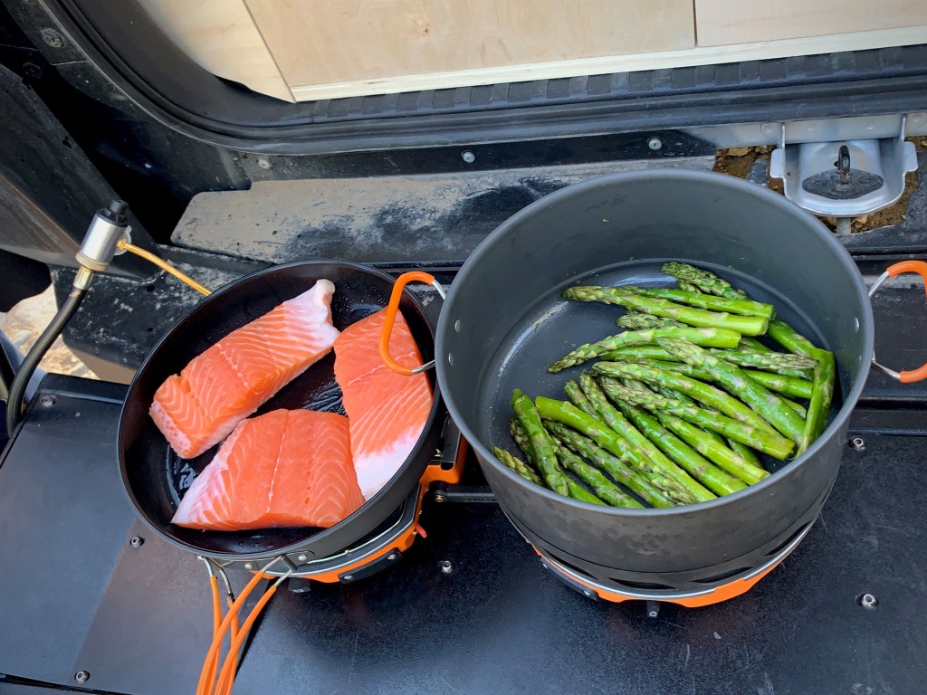 - Preparing the salmon: I usually prepare the salmon before we leave home, because I don’t want any salmon smells around camp after dinner is over. Any packaging the salmon originally came in, as well as the salmon skin does not come on the road with us. Even if you have a really good bear-proof trash receptacle, it’s good practice to be smart about what kinds of smells you’re keeping around your camp. Before you leave home, unwrap the salmon and rinse it well under cold water. Pat dry with paper towels, and put filets in a washable container. Keep refrigerated until ready to cook, and make sure you have a good way to wash your hands at camp while handling raw fish. Do not pre-salt the salmon unless you’ll be cooking it within an hour or so. Salt begins to cook the salmon if it sits on the flesh for too long. I really like using Mowi brand Skinless Atlantic Salmon 2pk. Otherwise you can ask your fish monger to remove the skin for you, or do it yourself with a good boning knife and lots of confidence.